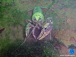 Eigentlich auch per Zufall habe ich dann angefangen regelmäßig mit meiner Tauchlampe in die Flossen hinein zu leuchten. Einmal saß ein großer Krebs in den Flossen. Da kamen mir die ersten Fragen. Was macht ein Krebs in einer Flosse? Wie kommt er da hinein und wieder heraus? In unmittelbarer Nähe sind weder Pflanzen oder Steine um sich zu verstecken. Wovon ernährt sich der Krebs hier? Bei einem nächsten Tauchgang habe ich natürlich nachgesehen, ob der Krebs noch da ist. Irgendwann war er dann nicht mehr da. Offensichtlich konnte er aus der senkrecht nach oben zeigenden Öffnung heraus schwimmen. Eine wirkliche Leistung!